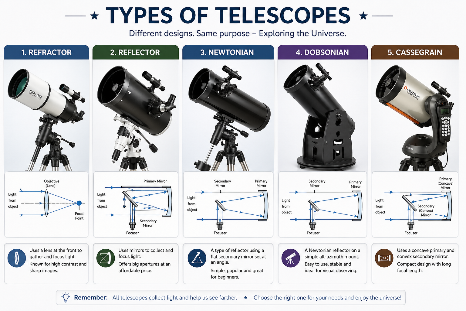 Understanding Telescope Types: Refractor, Reflector, Newtonian, Dobsonian, and Cassegrain